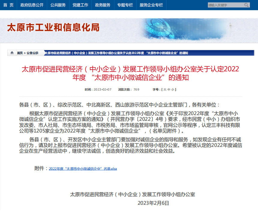 2023年2月6日,太原市工信局发布市促进民营经济(中小企业)发展工作领导小组办公室关于认定2022年度“太原市中小微诚信企业”的通知,我司位于公示名单内。