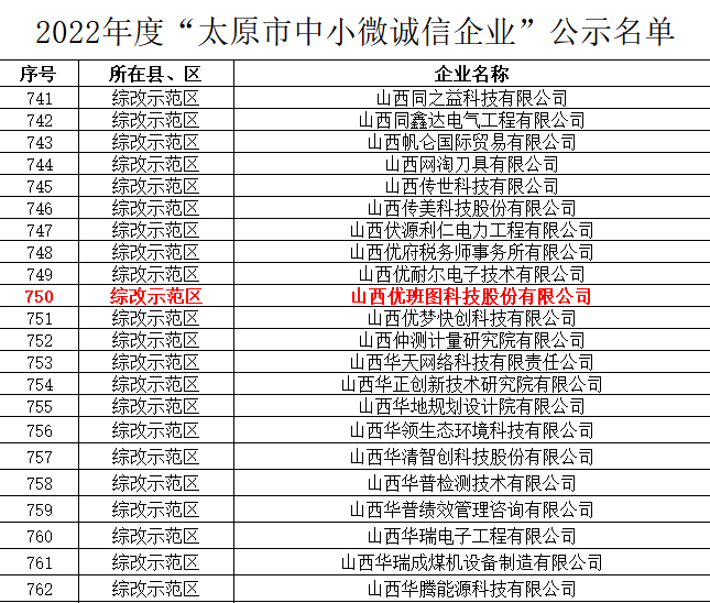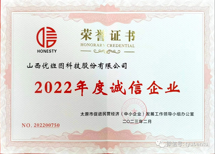 山西优班图科技股份有限公司自成立以来一直十分注重企业的诚信建设,严于律己,本次被认定为2022年度“太原市中小微诚信企业”,是对我司不断增强经营风险和信用风险意识,积极推进企业诚信建设,加强内控制度建设,完善企业信用管理的认可与肯定。