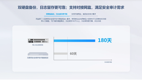 • 双硬盘备份,日志留存更可靠;支持对接网监,满足安全审计需求