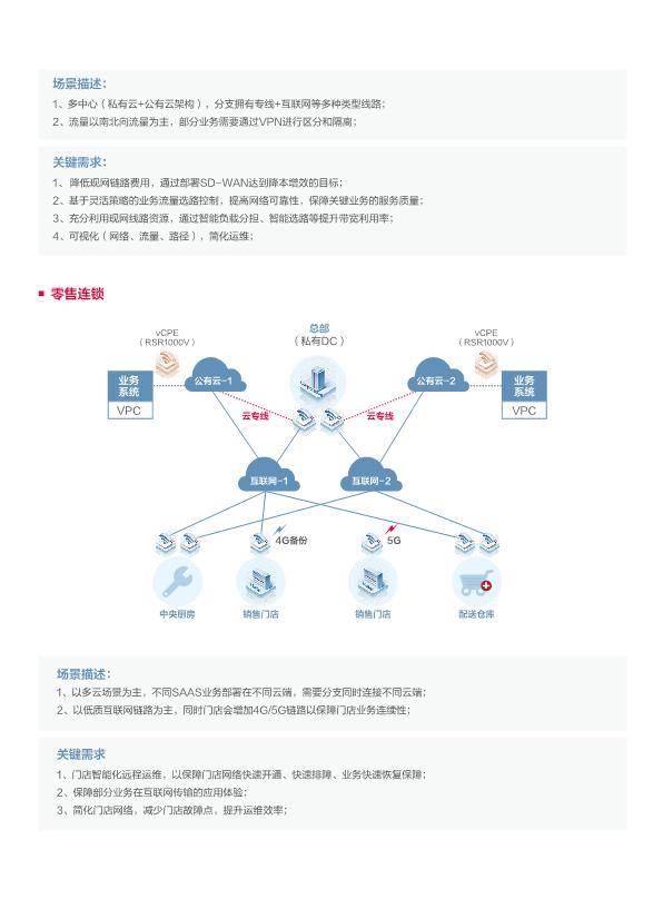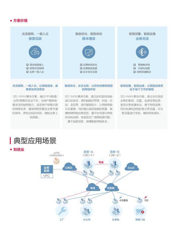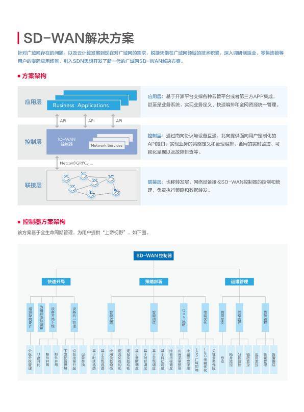 针对广域网存在的问题,以及云计算发展到现在对广域网的需求,锐捷凭借在广域网领域的技术积累,深入调研制造业、零售连锁等用户的实际应用场景,引入SDN思想开发了新一代的广域网SD-WAN解决方案。